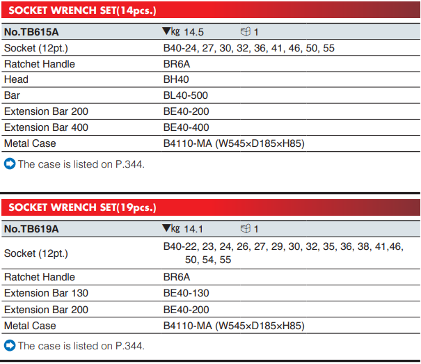 Toàn bộ bộ khẩu KTC TB615A đóng trong hộp nhựa, trọng lượng: 14.5 kg. Made in Japan.