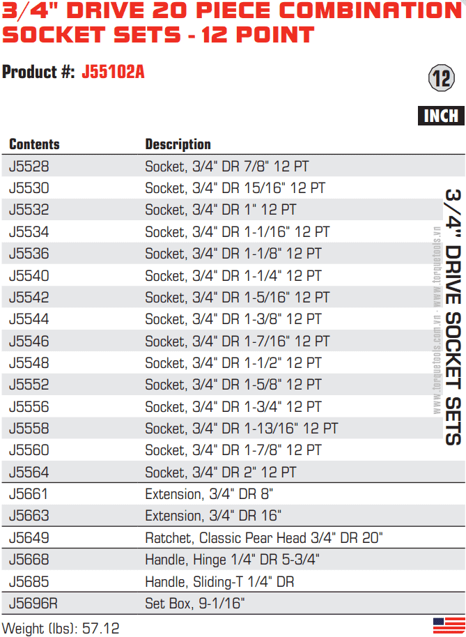 - Khẩu 12 cạnh 3/4"(7/8-2"): 15 chiếc.