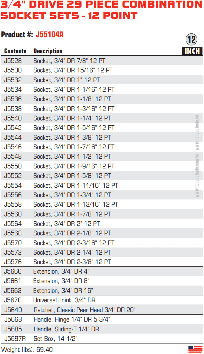 Bộ dụng cụ Proto J55104A,bộ khẩu Proto J55104A là hộp dụng cụ 29 chi tiết, size khẩu đầu vào 3/4", chuyên dùng để siết/vặn bulong, đai ốc, vít trong công nghiệp.Các chi tiết trong bộ khẩu Proto J55104A gồm: