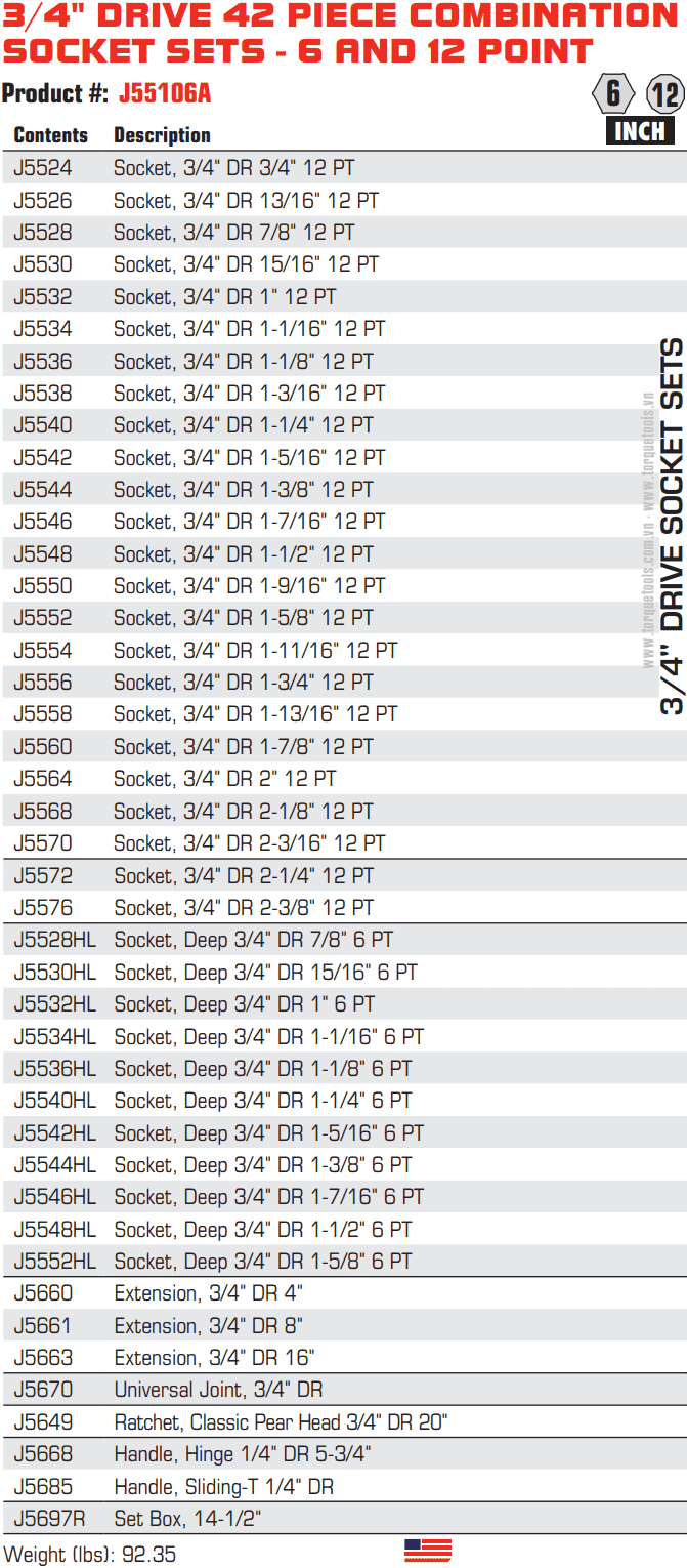- Khẩu 6 cạnh 3/4"(7/8-1-5/8"): 11 chiếc.