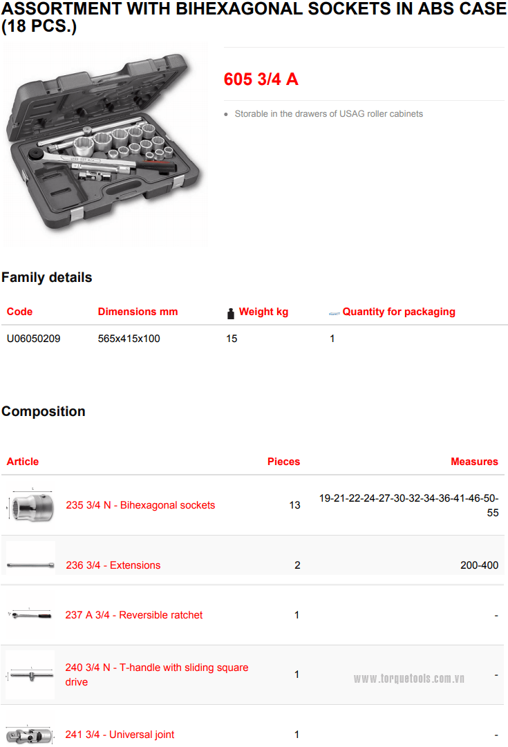 Toàn bộ bộ khẩu USAG 605 3/4 A đóng trong hộp nhựa, (565x415x100), trọng lượng:15 kg. Made in Italy.