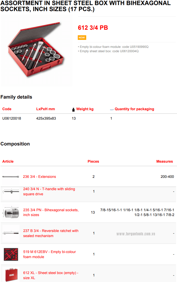 Toàn bộ bộ khẩu USAG 612 3/4 PB đóng trong hộp nhựa, (425x395x83), trọng lượng:13 kg. Made in Italy.