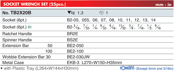 Bộ dụng cụ KTC TX2X20B, bộ khẩu KTC TX2X20B, KTC socket sets TX2X20B: là hộp dụng cụ 25 chi tiết, size khẩu đầu vào 1/4", chuyên dùng để siết/vặn bulong, đai ốc, vít trong công nghiệp.Các chi tiết trong bộ khẩu KTC TX2X20B gồm: