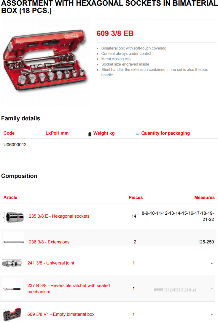 Toàn bộ bộ khẩu USAG 609 3/8 EB đóng trong hộp nhựa. Made in Italy.