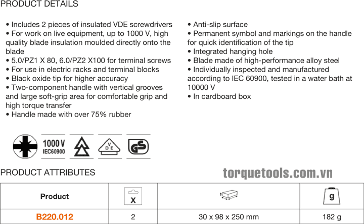 Bộ tô vít cách điện Bahco B220.012, Bahco VDE screwdriver B220.012: thuộc dòng sản phẩm tô vít cách điện VDE ERGO™ của Bahco, chuyên siết chính xác các loại vít theo tiêu chuẩn ERGO™ process trong môi trường điện cao thế (< 1.000 V). Bộ tô vít cách điện Bahco B220.012 gồm 2 chiếc tô vít: