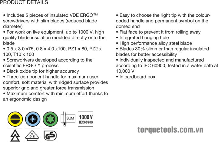 Bộ tô vít cách điện Bahco BE-9872SL, Bahco VDE screwdriver BE-9872SL: thuộc dòng sản phẩm tô vít cách điện VDE ERGO™ của Bahco, chuyên siết chính xác các loại vít theo tiêu chuẩn ERGO™ process trong môi trường điện cao thế (< 1.000 V). Bộ tô vít cách điện Bahco BE-9872SL gồm 5 chiếc tô vít: