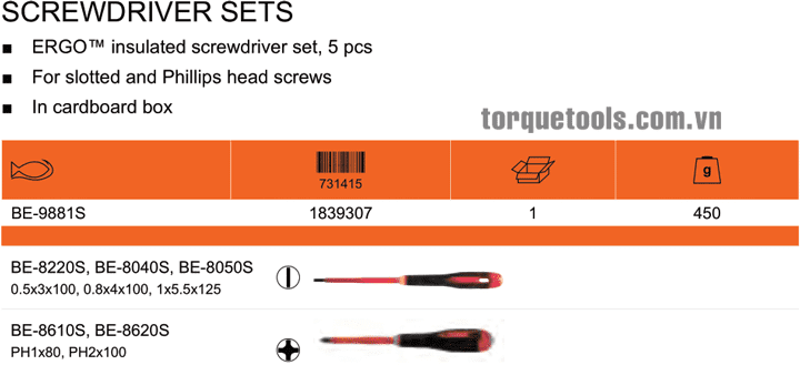 Bộ tô vít cách điện Bahco BE-9881S, Bahco VDE screwdriver BE-9881S: thuộc dòng sản phẩm tô vít cách điện VDE ERGO™ của Bahco, chuyên siết chính xác các loại vít theo tiêu chuẩn ERGO™ process trong môi trường điện cao thế (< 1.000 V). Bộ tô vít cách điện Bahco BE-9881S gồm 5 chiếc tô vít: