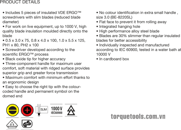 Bộ tô vít cách điện Bahco BE-9881SL, Bahco VDE screwdriver BE-9881SL: thuộc dòng sản phẩm tô vít cách điện VDE ERGO™ của Bahco, chuyên siết chính xác các loại vít theo tiêu chuẩn ERGO™ process trong môi trường điện cao thế (< 1.000 V). Bộ tô vít cách điện Bahco BE-9881SL gồm 5 chiếc tô vít: