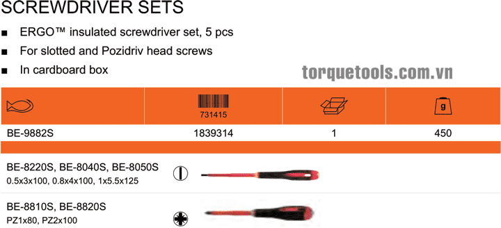 Bộ tô vít cách điện Bahco BE-9882S, Bahco VDE screwdriver BE-9882S: thuộc dòng sản phẩm tô vít cách điện VDE ERGO™ của Bahco, chuyên siết chính xác các loại vít theo tiêu chuẩn ERGO™ process trong môi trường điện cao thế (< 1.000 V). Bộ tô vít cách điện Bahco BE-9882S gồm 5 chiếc tô vít: