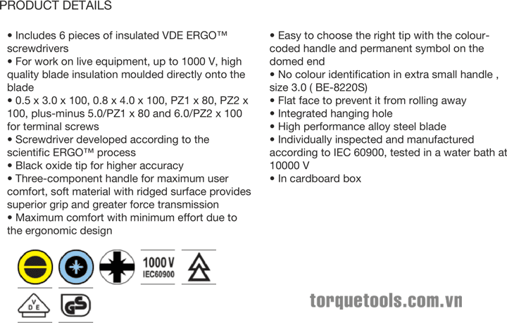 Bộ tô vít cách điện Bahco BE-9884S, Bahco VDE screwdriver BE-9884S: thuộc dòng sản phẩm tô vít cách điện VDE ERGO™ của Bahco, chuyên siết chính xác các loại vít theo tiêu chuẩn ERGO™ process trong môi trường điện cao thế (< 1.000 V). Bộ tô vít cách điện Bahco BE-9884S gồm 6 chiếc tô vít: