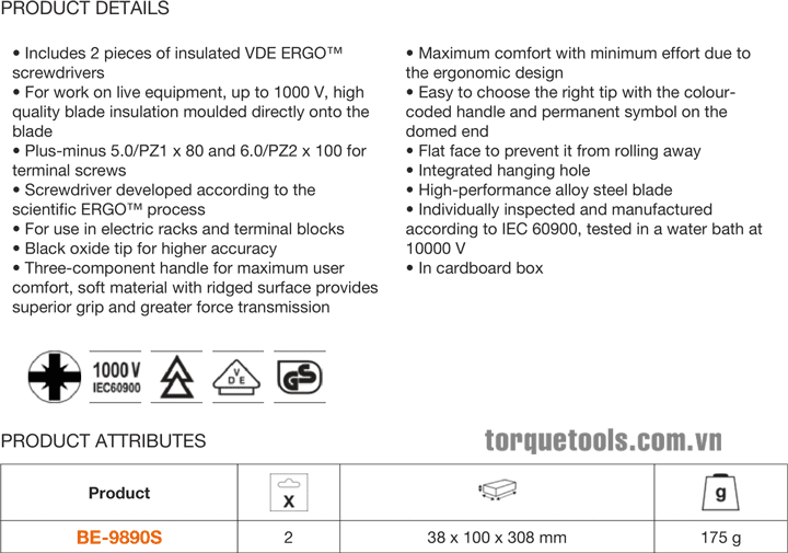 Bộ tô vít cách điện Bahco BE-9890S, Bahco VDE screwdriver BE-9890S: thuộc dòng sản phẩm tô vít cách điện VDE ERGO™ của Bahco, chuyên siết chính xác các loại vít theo tiêu chuẩn ERGO™ process trong môi trường điện cao thế (< 1.000 V). Bộ tô vít cách điện Bahco BE-9890S gồm 2 chiếc tô vít: