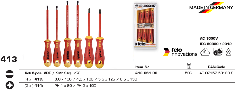 - Bộ tô vít cách điện Felo 413 961 98 (Felo VDE scewdriver set 413 961 98) gồm 6 chiếc tô vít cách điện (4 chiếc 2 cạnh tiêu chuẩn Slotted, 2 chiếc 4 cạnh tiêu chuẩn Phillips), sử dụng trong môi trường điện cao thế (< 1.000 V).
