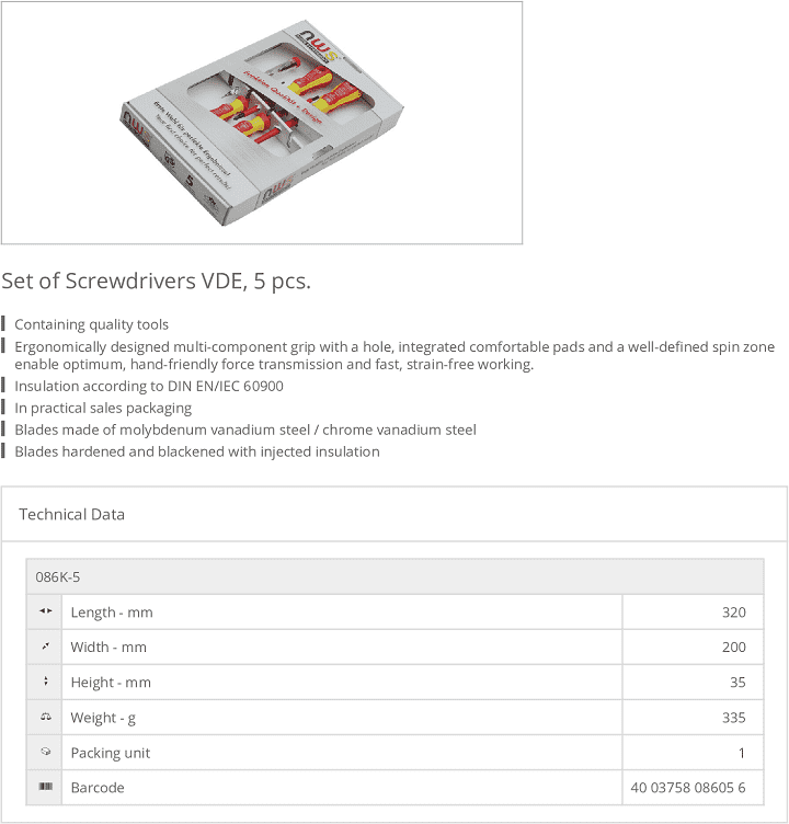 Bộ tô vít cách điện NWS 086K-5, NWS VDE screwdriver sets 086K-5: là hộp dụng cụ 5 chi tiết, chuyên dùng để xử lý các chi tiết sử dụng trong môi trường điện cao thế (< 1.000 V). Các chi tiết trong bộ tô vít NWS 086K-5 gồm: