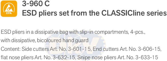 Bộ dụng cụ chống tĩnh điện Bernstein 3-960 C, Bernstein ESD pliers sets 3-960 C thuộc dòng sản phẩm chất lượng cao, có 4 chi tiết, chuyên dùng trong môi trường cần chống tĩnh điện (ESD).Các chi tiết trong bộ dụng cụ Bernstein 3-960 C gồm: