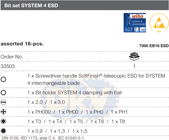 Bộ dụng cụ chống tĩnh điện Wiha 33503, Wiha ESD tools set 33503 thuộc dòng sản phẩm tô vít siết chính xác 16 chiếc của Wiha, chuyên siết các loại bulong, đai ốc lục giác trong môi trường cần chống tĩnh điện (ESD). Bộ dụng cụ chống tĩnh điện Wiha 33503 gồm: