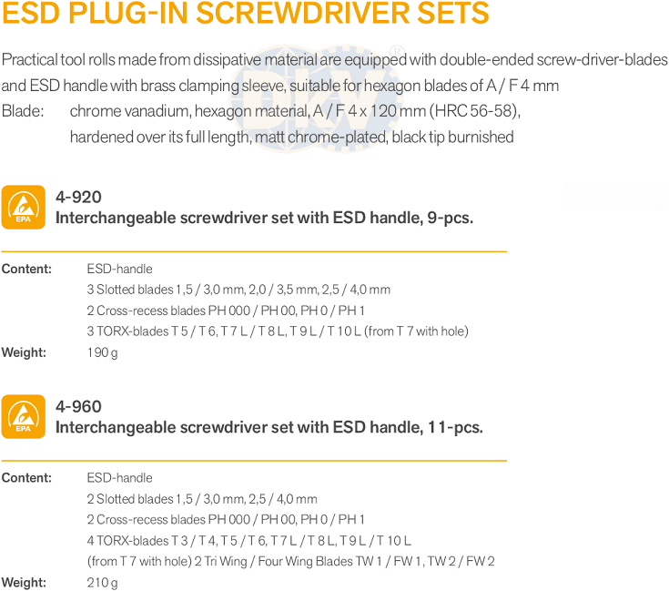 Bộ tô vít chống tĩnh điện Bernstein 4-920, Bernstein ESD screwdriver sets 4-920 thuộc dòng sản phẩm tô vít siết chính xác 9 chiếc của Bernstein, chuyên siết các loại bulong, đai ốc 2, 4, 6 cạnh trong môi trường cần chống tĩnh điện (ESD). Bộ tô vít chống tĩnh điện Bernstein 4-920 gồm:
