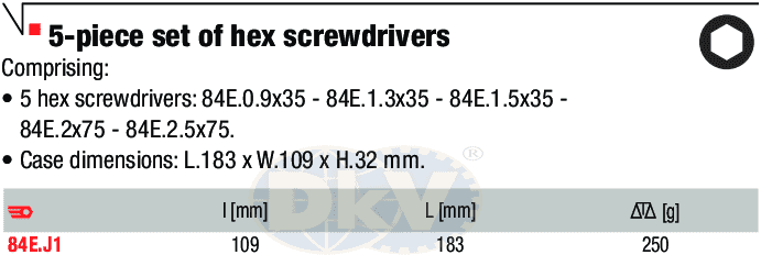 Bộ tô vít chống tĩnh điện Facom 84E.J1, Facom ESD screwdriver slotted head 84E.J1 thuộc dòng sản phẩm tô vít siết chính xác 5 chiếc của Facom, chuyên siết các loại bulong, đai ốc 2 cạnh trong môi trường cần chống tĩnh điện (ESD). Bộ tô vít chống tĩnh điện Facom 84E.J1 gồm: