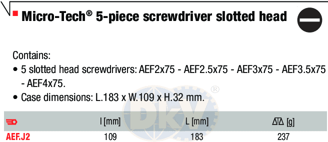 Bộ tô vít chống tĩnh điện Facom AEF.J2, Facom ESD screwdriver slotted head AEF.J2 thuộc dòng sản phẩm tô vít siết chính xác 5 chiếc của Facom, chuyên siết các loại bulong, đai ốc 2 cạnh trong môi trường cần chống tĩnh điện (ESD). Bộ tô vít chống tĩnh điện Facom AEF.J2 gồm: