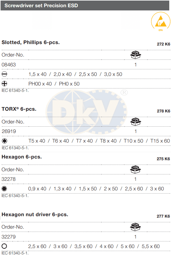 Bộ tô vít chống tĩnh điện Wiha 32278, Wiha ESD screwdriver set 32278 thuộc dòng sản phẩm tô vít siết chính xác 6 chiếc của Wiha, chuyên siết các loại bulong, đai ốc lục giác trong môi trường cần chống tĩnh điện (ESD). Bộ tô vít chống tĩnh điện Wiha 32278 gồm: