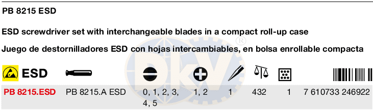 Bộ tô vít chống tĩnh điện PB Swiss PB 8615 ESD, PB Swiss ESD electronics screwdriver PB 8615 ESD (Code: 7 610733 246922) thuộc dòng sản phẩm tô vít siết chính xác 10 chiếc của PB Swiss, chuyên siết các loại bulong, đai ốc 2 trong môi trường cần chống tĩnh điện (ESD). Bộ tô vít chống tĩnh điện PB Swiss PB 8615 ESD gồm: