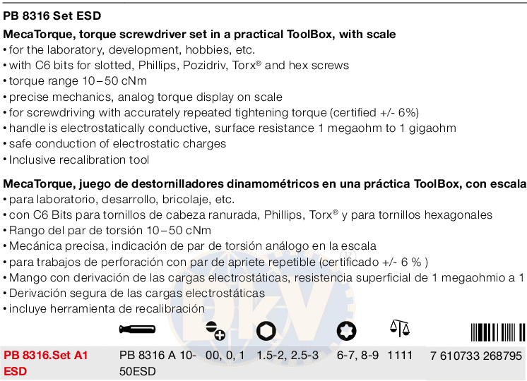 - Đầu cắm tô vít dòng PB PB 8316 A 10-50 ESD: 1 chiếc.