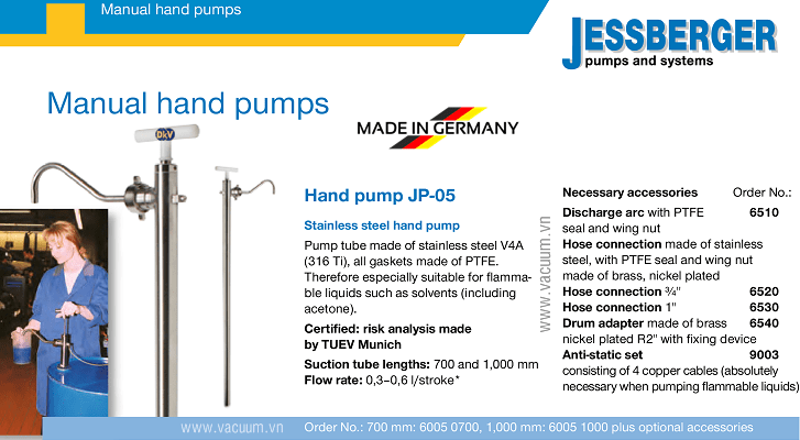 - Bơm tay thùng phuy Jessberger JP-05 (6005 0700) được chế tạo bằng vật liệu stainless steel 316Ti, vật liệu seal: PTFE. Lưu lượng: 0.3 - 0.6 lít/hành trình lên xuống, đường kính cột bơm max 32 mm. Chiều dài cột bơm 700 mm. Trang bị bộ chống tĩnh điện giảm nguy cơ cháy nổ (4 sợi cáp đồng).