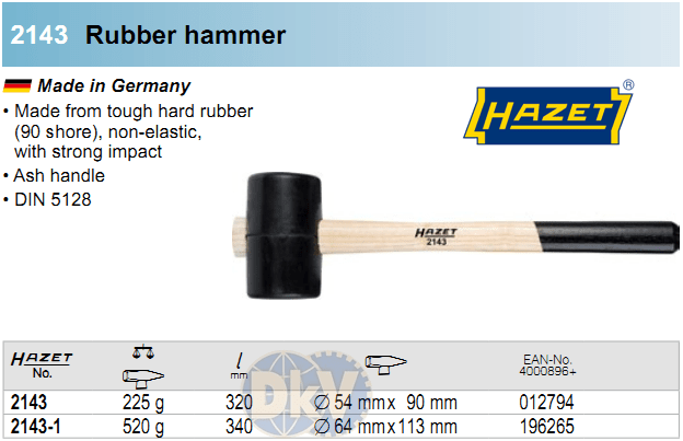 - Búa cao su Hazet 2143 chế tạo theo tiêu chuẩn: DIN 5128, đầu búa được làm bằng chất liệu cao su với tay cầm bằng gỗ, chịu va đập tốt, chống toét đầu.