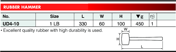 - Búa cao su đầu tròn KTC UD4-10, KTC round rubber hammer UD4-10: là loại búa đầu tròn có tiết diện: Ø 60 mm, trọng lượng búa: 0.45 kg, chiều dài búa: 330 mm chuyên dùng trong công nghiệp.