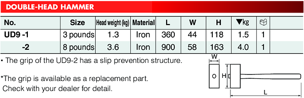 - Búa gỗ đầu tròn KTC UD9-2, KTC double-head hammer UD9-2: là loại búa đầu tròn có tiết diện: Ø 58 mm, trọng lượng búa: 4 kg, chiều dài búa: 900 mm chuyên dùng trong công nghiệp.