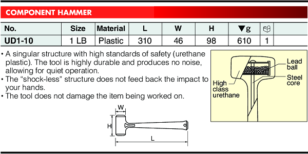 - Búa nhựa đầu tròn KTC UD1-10, KTC round plastic hammer UD1-10: là loại búa đầu tròn có tiết diện: Ø 46 mm, trọng lượng búa: 0.61 kg, chiều dài búa: 310 mm chuyên dùng trong công nghiệp.