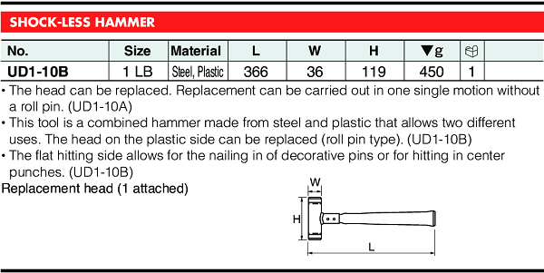 - Búa nhựa đầu tròn KTC UD1-10B, KTC round plastic hammer UD1-10B: là loại búa đầu tròn có tiết diện: Ø 36 mm, trọng lượng búa: 0.45 kg, chiều dài búa: 366 mm chuyên dùng trong công nghiệp.