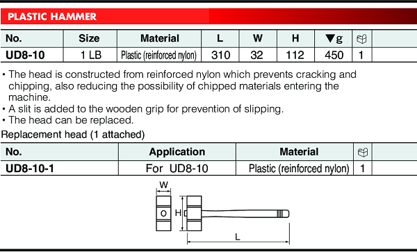 - Búa nhựa đầu tròn KTC UD8-10, KTC round plastic hammer UD8-10: là loại búa đầu tròn có tiết diện: Ø 32 mm, trọng lượng búa: 0.45 kg, chiều dài búa: 310 mm chuyên dùng trong công nghiệp.
