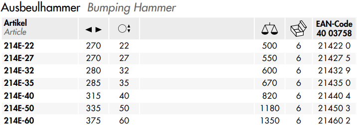 - Búa gỗ NWS 214E-50, NWS wood hammer 214E-50: là loại búa đầu tròn, có tiết diện: 50 mm, chiều dài búa: 335 mm, trọng lượng búa: 1180 g, chuyên dùng trong công nghiệp.