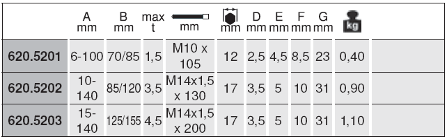 Cảo 2 chấu KS Tools 620.5201 trang bị trục ren M10x105 tạo lực đẩy, phía đầu gắn bulong 6 cạnh 12 mm, thuận tiện khi dùng cờ lê, mỏ lết để siết/vặn (nhà sản xuất khuyến cáo lực siết max: 25 N.m, dùng cờ lê lực để siết đảm bảo độ bền của cảo. Tham khảo: