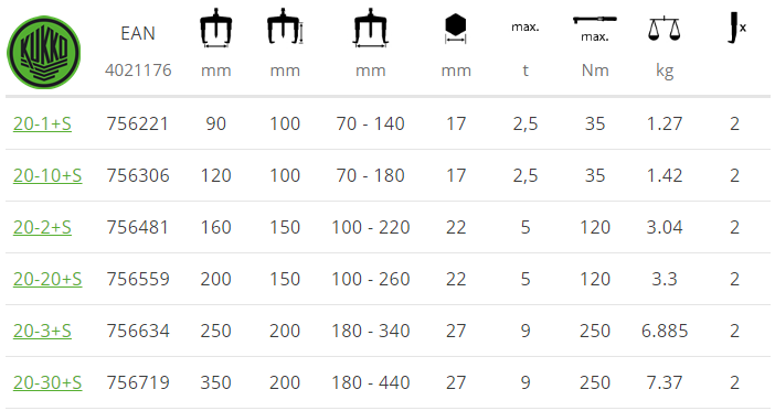 CẢO CƠ KHÍ 2 CHẤU KUKKO 20-3+S | KUKKO 2 JAW PULLER 20-3+S | 9 tấn | 250 mm