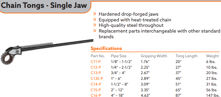 - Cờ lê dây xích Petol C11-P có đường kính mở từ: 3.2 - 38 mm, tổng chiều dài 508 mm. Kẹp được dễ dàng lắp vào và tháo ra, và có sẵn ở hai kích cỡ khác nhau để cung cấp nhiều lựa chọn thích hợp cho công việc.
