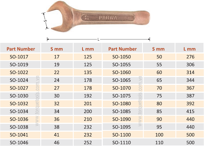 - Cờ lê đóng chống cháy nổ Pahwa SO-1024, Pahwa non sparking open end slogging wrench SO-1024, là loại cờ lê đóng,một đầu miệng hở size: 24 mm,