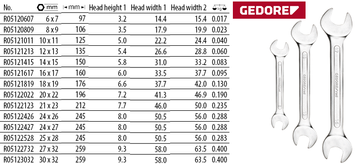 - Cờ lê Gedore Red R05121617, cờ lê miêng hở Gedore Red R05121617 thuộc dạng miệng hở hai đầu 16x17 mm (một đầu 16 mm, đầu còn lại 17 mm), chuyên dùng để siết bulong, đai ốc trong công nghiệp.
