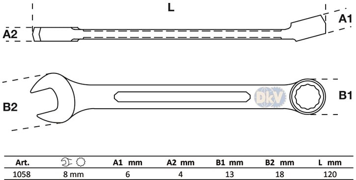 - Cờ lê BGS 1058, cờ lê miêng hở/tròng BGS 1058, BGS combination spanner 1058: thuộc dạng cờ lê một đầu miệng hở, một đầu tròng, cùng size: 8 mm, chiều dài: 120 mm, chuyên dùng để siết bulong, đai ốc trong công nghiệp.