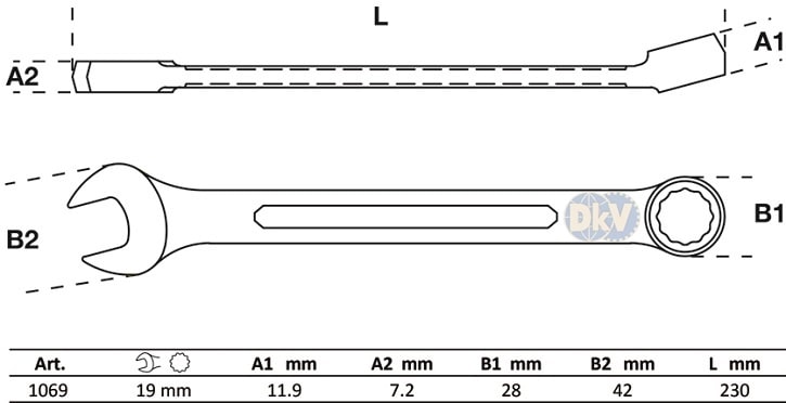 - Cờ lê BGS 1069, cờ lê miêng hở/tròng BGS 1069, BGS combination spanner 1069: thuộc dạng cờ lê một đầu miệng hở, một đầu tròng, cùng size: 19 mm, chiều dài: 230 mm, chuyên dùng để siết bulong, đai ốc trong công nghiệp.