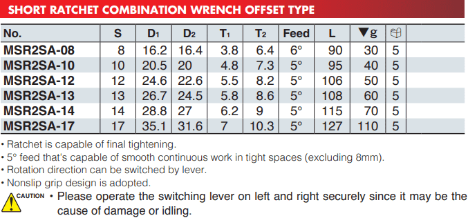 - Cờ lê KTC MSR2SA-12, cờ lê vòng miệng KTC MSR2SA-12, KTC combination spanner MSR2SA-12: thuộc dạng 1 đầu tròng, 1 đầu hở, size đầu: 12 mm, chiều dài cờ lê: 106 mm, chuyên dùng để siết bulong, đai ốc trong công nghiệp.