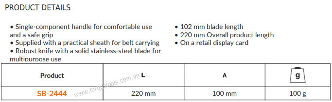 - Dao Bahco SB-2444, Bahco Knives SB-2444 có chiều dài tổng thể: 220 mm, chiều dài lưỡi dao 100 mm.