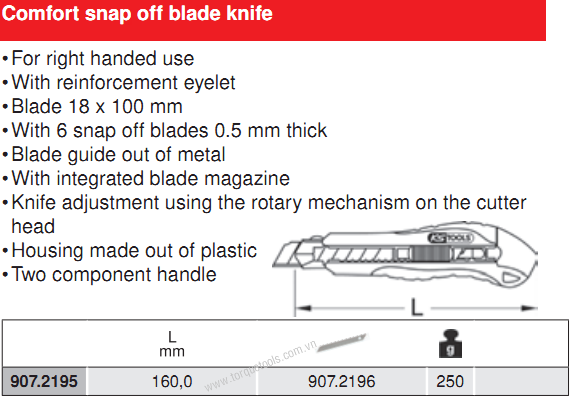 - Dao KS Tools 907.2195, KS Tools knife 907.2195 có chiều dài tổng thể 160 mm, độ dày lưỡi dao 0.5 mm, lưỡi dao có kích thước 18 x 100 mm.