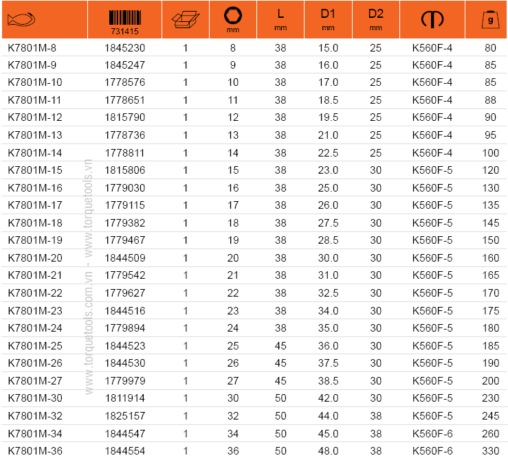- Khẩu đen 6 cạnh ngắn Bahco K7801M-32 thuộc dạng đầu khẩu cơ bản, dạng ngắn có chiều dài: 50 mm. Sử dụng phổ biến cho các thiết bị, súng siết có xung lực va đập cao.