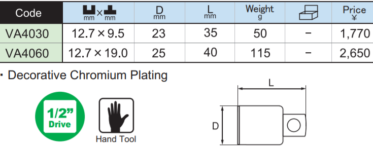 - Đầu chuyển đổi Asahi VA4060, khẩu chuyển đổi Asahi VA4060: là loại đầu khẩu công nghiệp, chuyên dùng để siết bulong, có size đầu vào vuông 1/2", size đầu ra 3/4". Đầu chụp bulong Asahi VA4060 được chế tạo từ thép cường lực có độ dai va đập cao.