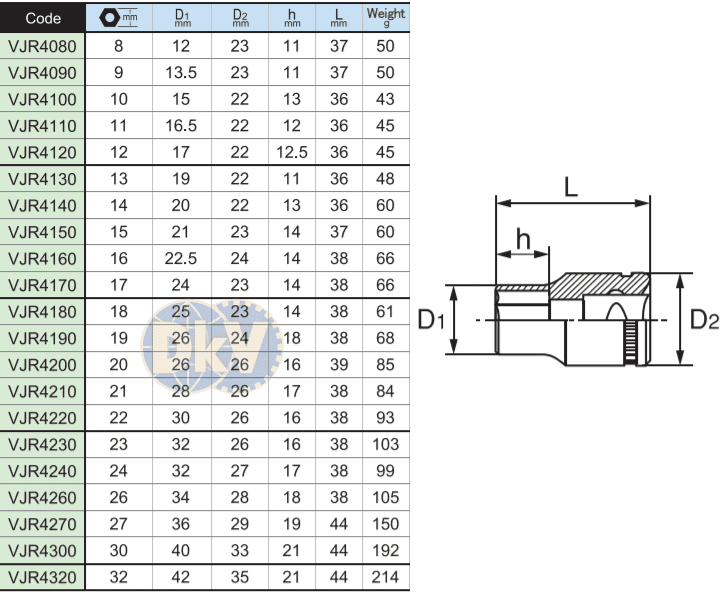 - Khẩu trắng 6 cạnh Asahi VJR4140 thuộc dạng đầu khẩu cơ bản, dạng ngắn, có chiều dài: 36 mm. Sử dụng phổ biến cho các thiết bị siết tay, hoặc súng siết có xung lực va đập nhỏ.