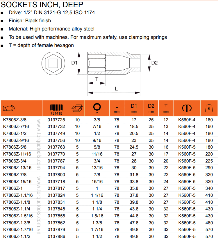 KHẨU CHỤP BULONG BAHCO K7806Z-1.1/4 | ĐẦU CHỤP BULONG BAHCO K7806Z-1.1/4 | 1/2" | 1-1/4"