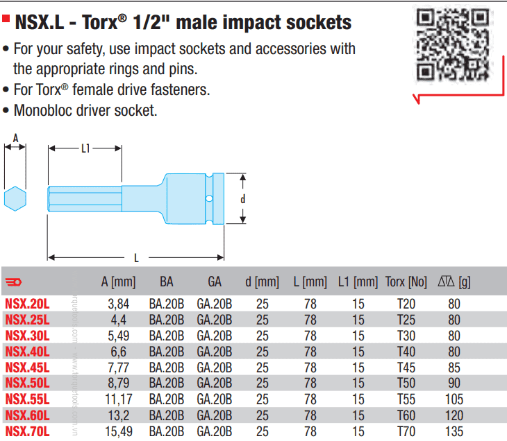 - Khẩu chụp bulong Facom NSX.50L, đầu chụp bulong Facom NSX.50L, Facom impact socket NSX.50L là loại đầu khẩu công nghiệp 6 cạnh, chuyên dùng để siết bulong, có size đầu vào vuông 1/2", size đầu ra T50. Đầu chụp bulong Facom NSX.50L được chế tạo từ thép đen cường lực có độ dai va đập cao.