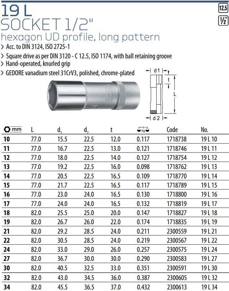 - Khẩu trắng Gedore 19 L 34 thuộc dạng đầu khẩu cơ bản, dạng dài, có chiều dài: 82 mm. Sử dụng phổ biến cho các thiết bị siết tay, hoặc súng siết có xung lực va đập nhỏ.
