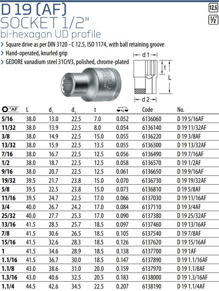 KHẨU CHỤP BULONG GEDORE D 19 1.1/4AF | ĐẦU CHỤP BULONG GEDORE D 19 1.1/4AF | 1/2" | 1.1/4"